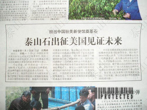 2005年4月22日,中國(guó)駐美國(guó)大使館新館舍奠基儀式隆重舉行,儀式上的奠基石就來(lái)自泰安,并且這塊奠基石將永遠(yuǎn)被鑲嵌在建成后的駐美使館大樓上。巧合的是,47年前的這一天--1958年4月22日,人民英雄紀(jì)念碑落成,紀(jì)念碑的基石選用的就是泰山花崗巖。今年3月2日,我國(guó)外交部首次與泰安有關(guān)部門對(duì)接了有關(guān)中國(guó)駐美大使館新館舍奠基石設(shè)計(jì)制作的相關(guān)事宜,根據(jù)外交部領(lǐng)導(dǎo)對(duì)奠基石的要求,泰山基石公司在第一時(shí)間將設(shè)計(jì)思路通過(guò)網(wǎng)絡(luò)傳給了遠(yuǎn)在北京的外交部,經(jīng)批準(zhǔn)后,公司精心選擇了一塊泰山青,用最好的工匠,用一個(gè)星期就做好了這塊重達(dá)600公斤的奠基石,并高標(biāo)準(zhǔn)地將國(guó)務(wù)委員唐家璇的親筆題詞刻在奠基石上。在奠基儀式上,中美政要及華裔著名建筑設(shè)計(jì)師貝聿明為工程奠基培土,外交部領(lǐng)導(dǎo)對(duì)公司提供的奠基石非常滿意。 中國(guó)駐美大使館將是我國(guó)目前在國(guó)外規(guī)模最大館舍,預(yù)計(jì)將于2008年投入使用。之所以選用泰山石為工程的奠基石,是與泰山的文化分不開(kāi)的。孔子登臨泰山以后,歷代文人墨客登泰山抒壯志,賦予泰山石以深厚的文化內(nèi)涵。北京天安門廣場(chǎng)、人民英雄紀(jì)念碑、人民大會(huì)堂的基石都特意選用了泰山花崗巖,象征著穩(wěn)如泰山。千百年來(lái),泰山已成為中華民族精神的組成內(nèi)容。